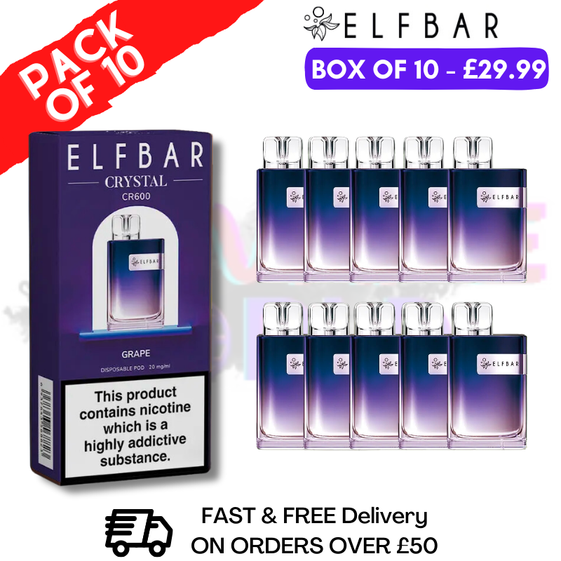Shop Elf Bar Crystal 600puff - Grape Box of 10 is a burst of vineyard sweetness with a cool undertone, a grape lover's dream! A perfect addtion to the Range!