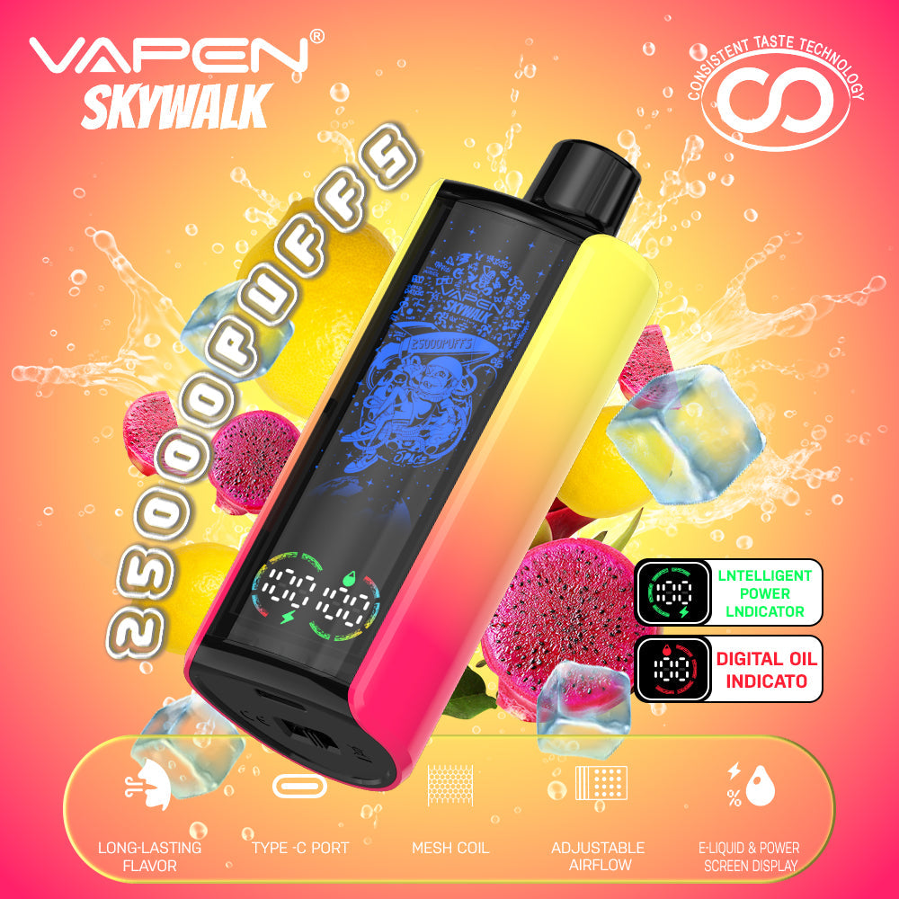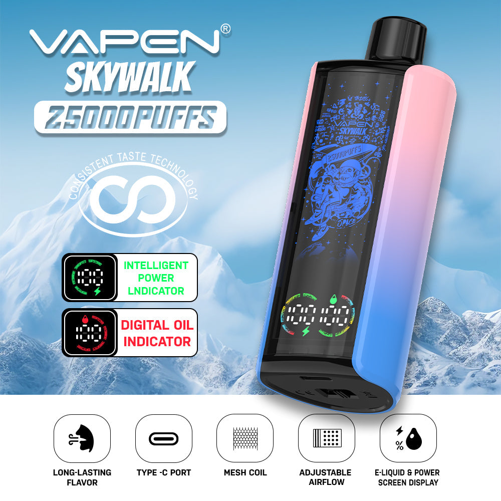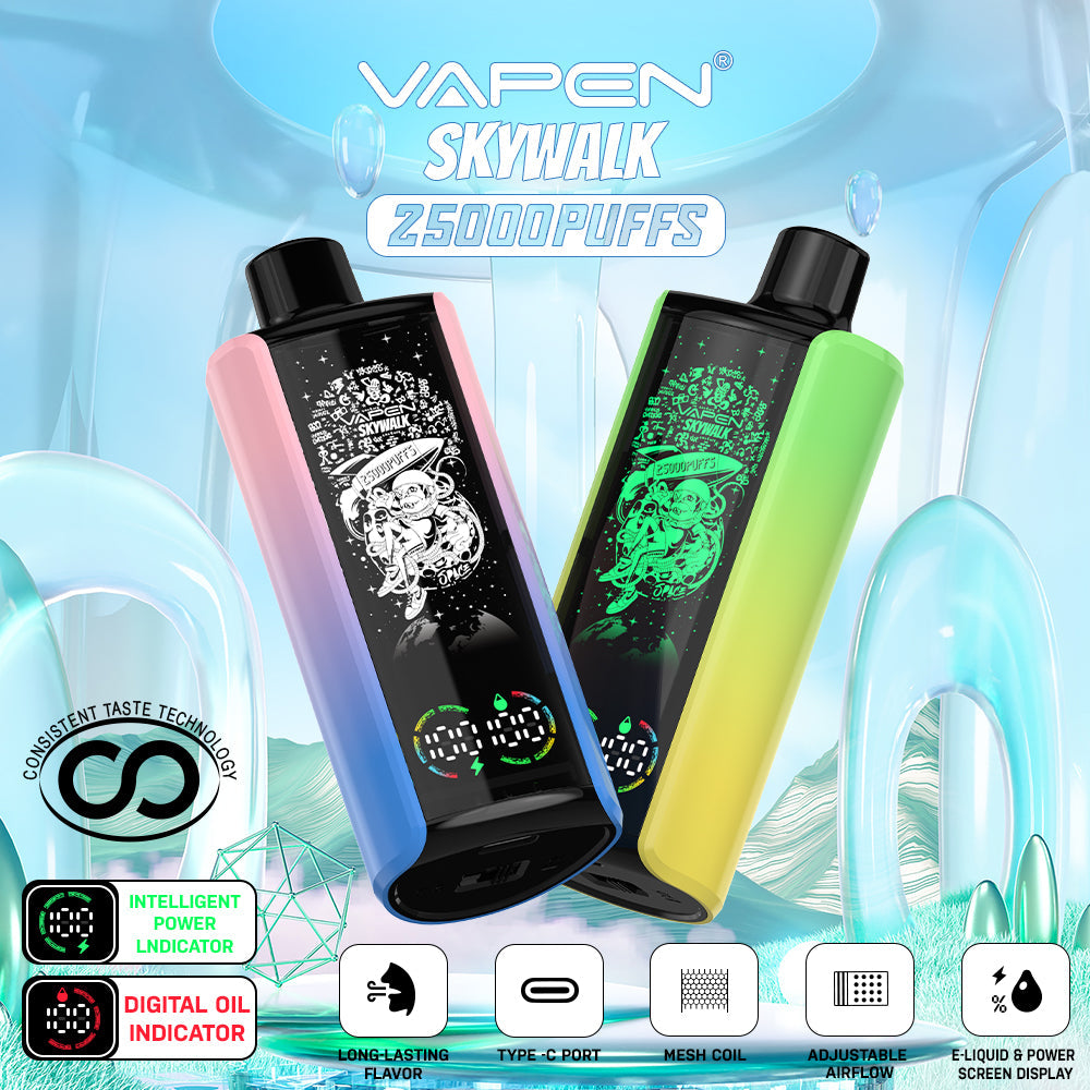The VAPEN SKYWALK 25K puff is a stylish disposable vape featuring a 30ml e-liquid capacity and a huge puff count of 25.000 puffs. With a 650mAh battery. Type-C charging. and adjustable airflow. it combines fashion and technology. The device features a smart oil and battery display. allowing users to easily monitor e-liquid levels and battery status. It also lights up with RGB colors during use and uses low-resistance mesh coils and consistent taste technology for a stable flavor experience.