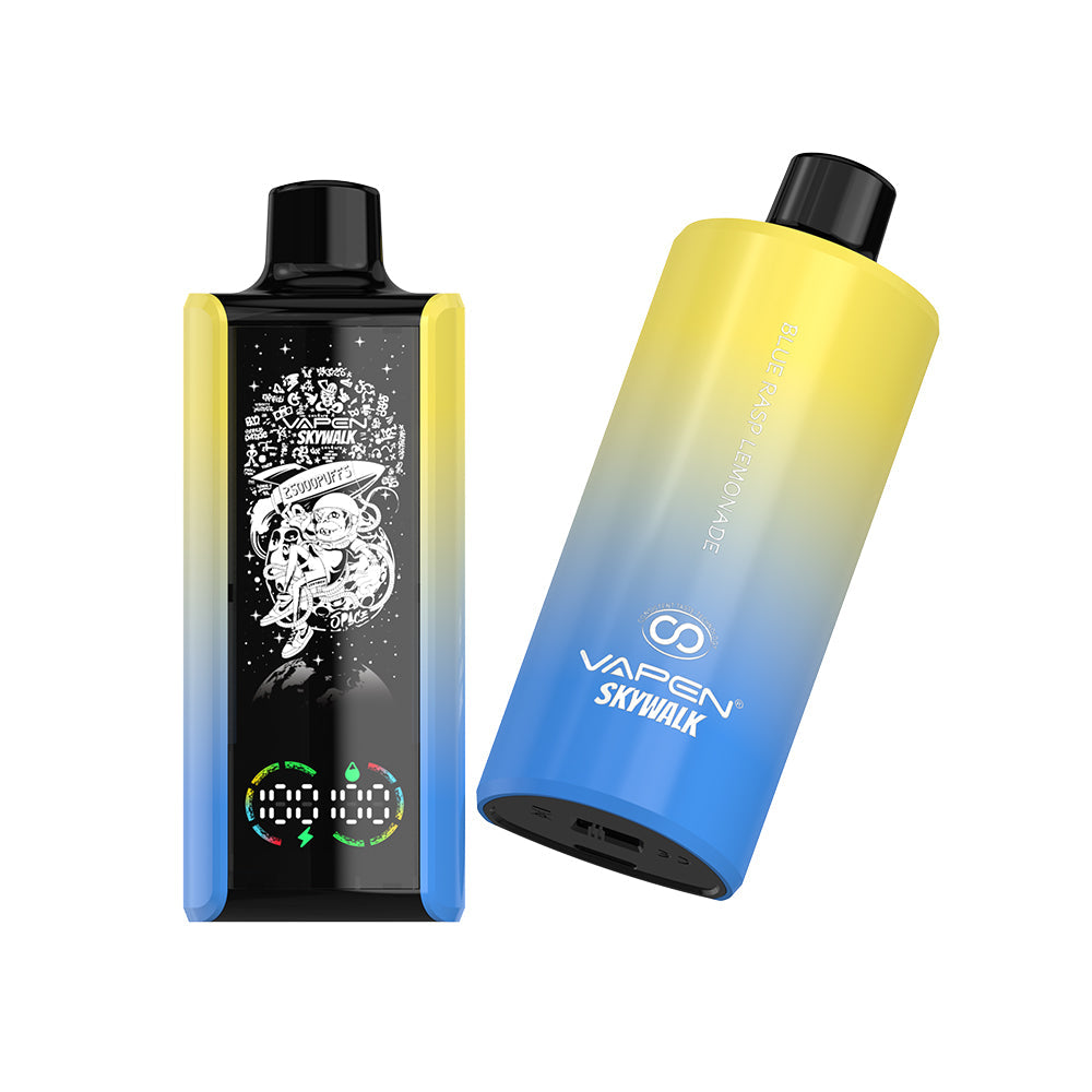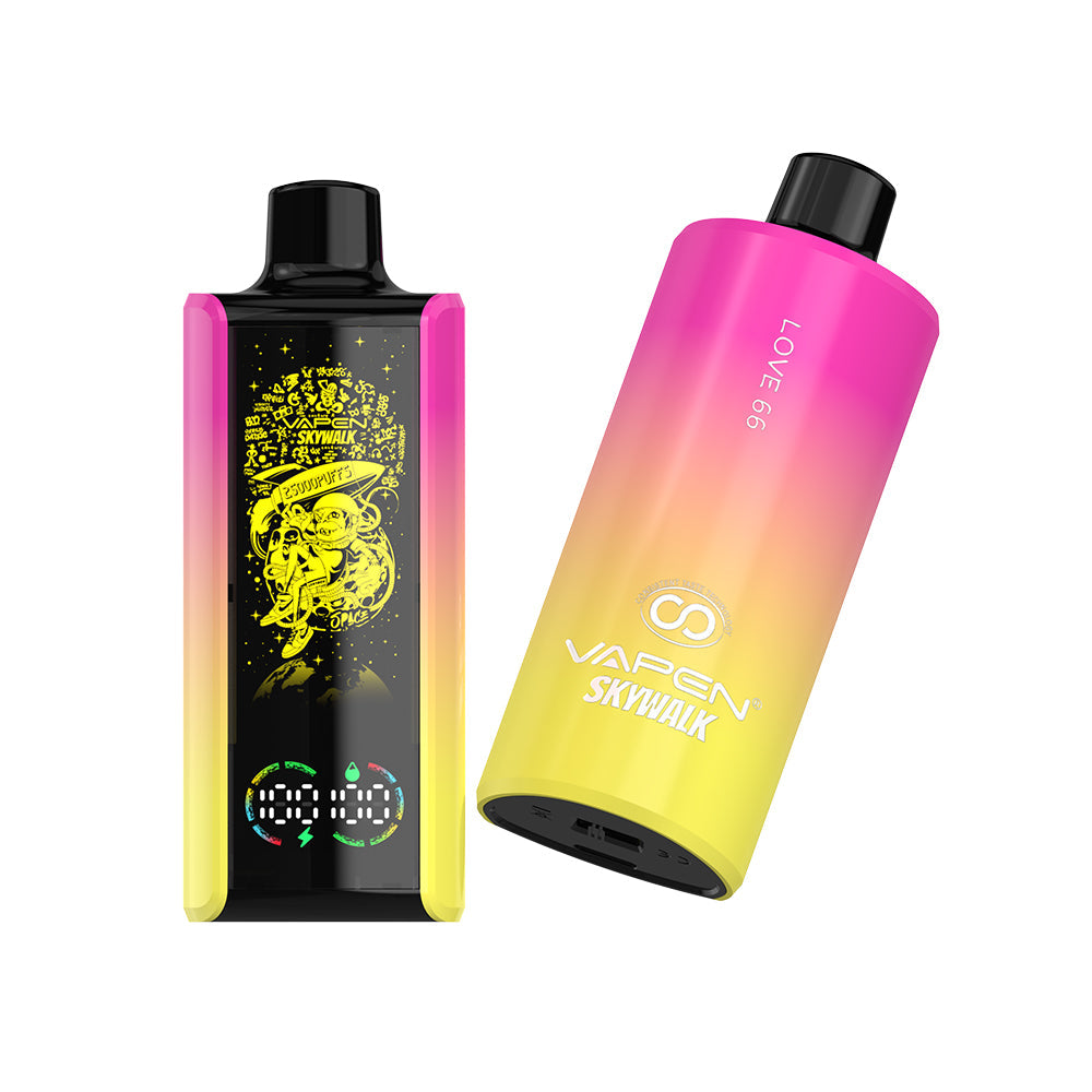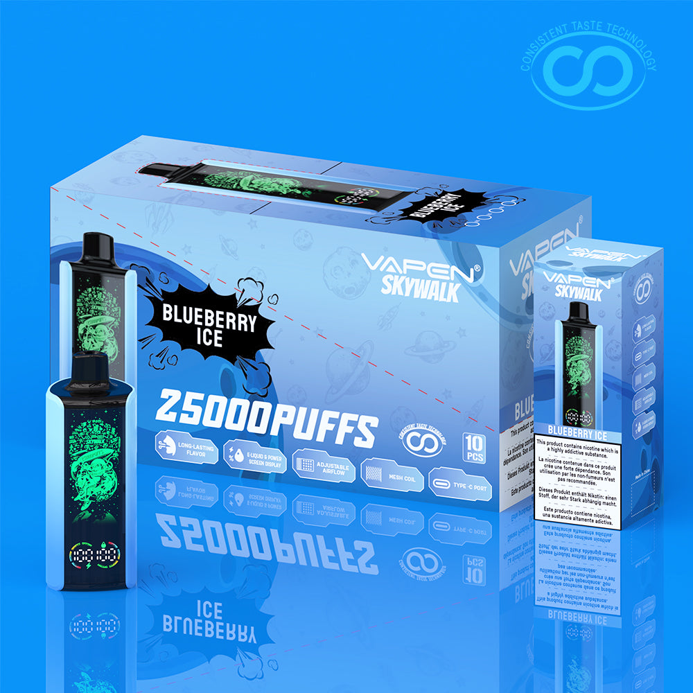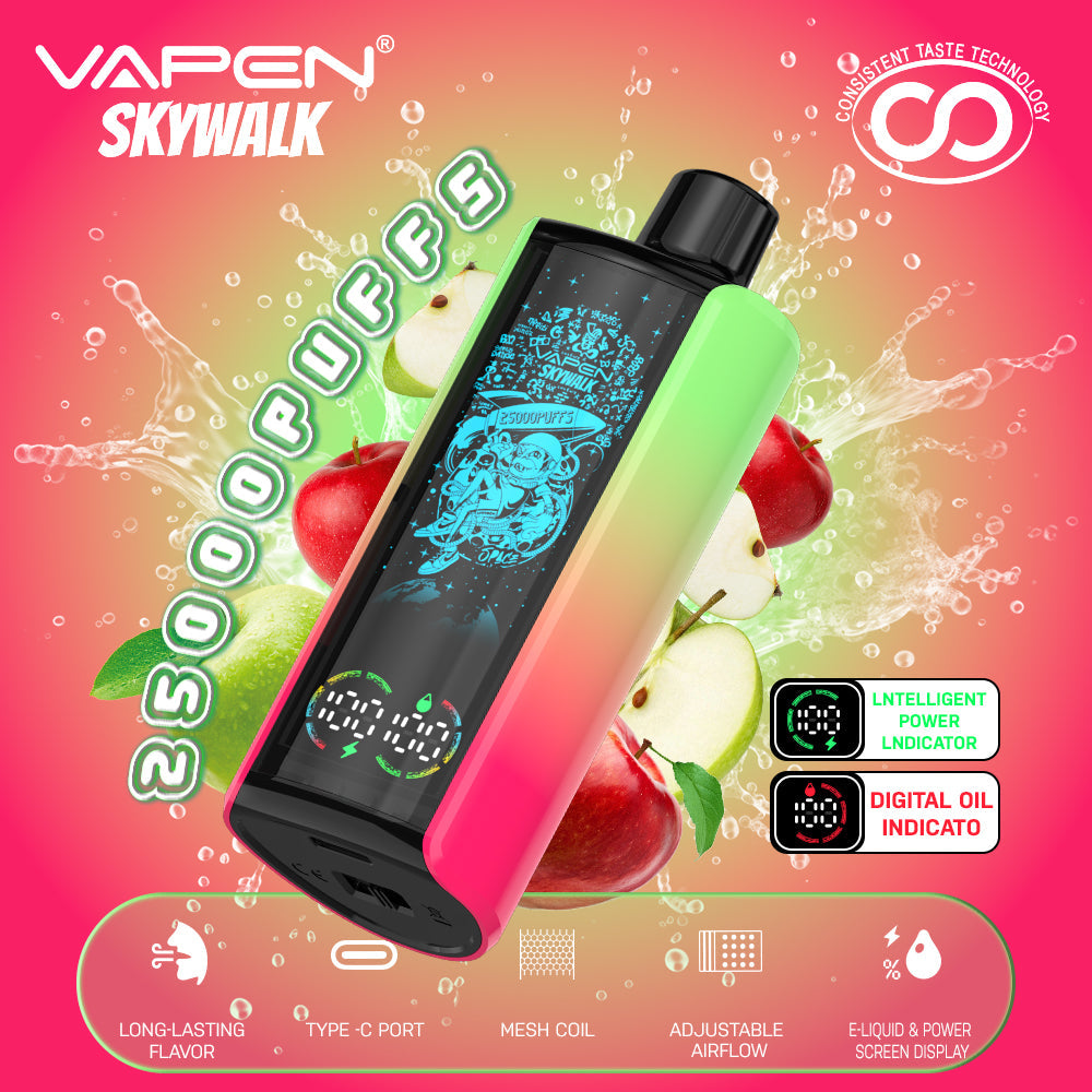 The VAPEN SKYWALK 25K puff is a stylish disposable vape featuring a 30ml e-liquid capacity and a huge puff count of 25.000 puffs. With a 650mAh battery. Type-C charging. and adjustable airflow. it combines fashion and technology. The device features a smart oil and battery display. allowing users to easily monitor e-liquid levels and battery status. It also lights up with RGB colors during use and uses low-resistance mesh coils and consistent taste technology for a stable flavor experience.