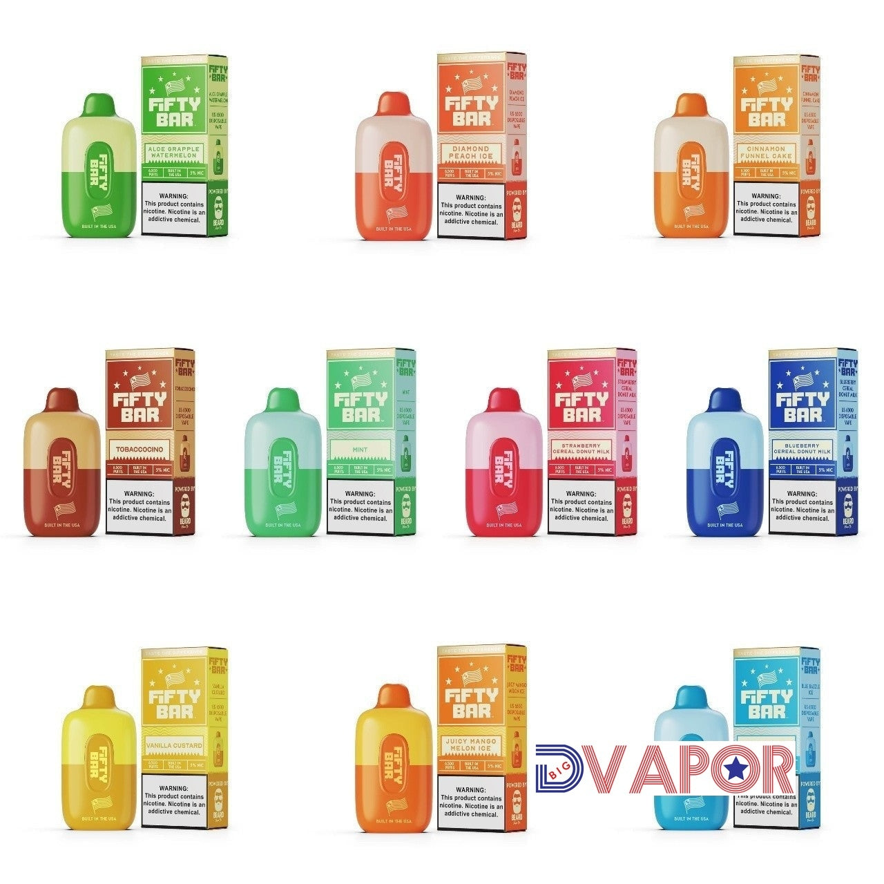 Treat your taste buds to the USA made FIFTY Bar! This unique disposable device has 6500 puffs of Beard Salt liquid with 10 amazing flavors to choose from. All of the ingredients including nicotine, juice, and components are made in the USA.. Rapid rechargeable via USB Type-C input. Here's a complete Fifty Bar Disposable Vape Flavor List: