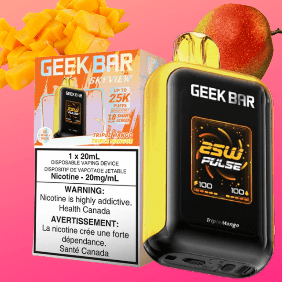 The Geek Bar Skyview 25K Disposable vape features 20ml of prefilled e-liquid, offering about 25,000 puffs. Moreover, the Skyview Triple Mango flavor offers a tropical, fruity escape with every puff. Packed with the rich, sweet flavor of ripe mangoes, this disposable vape elevates the classic fruit with three layers of deliciousness.