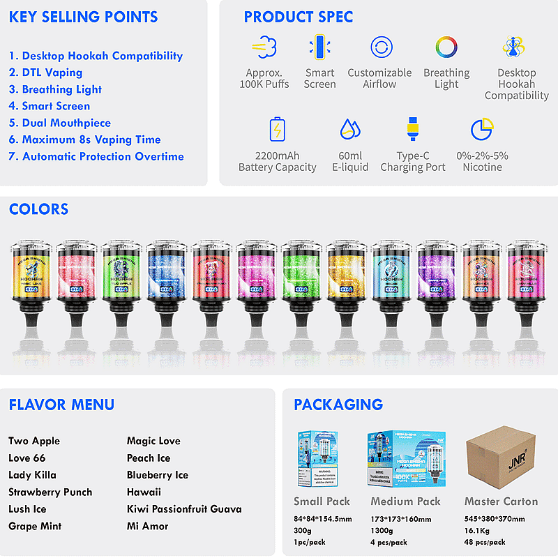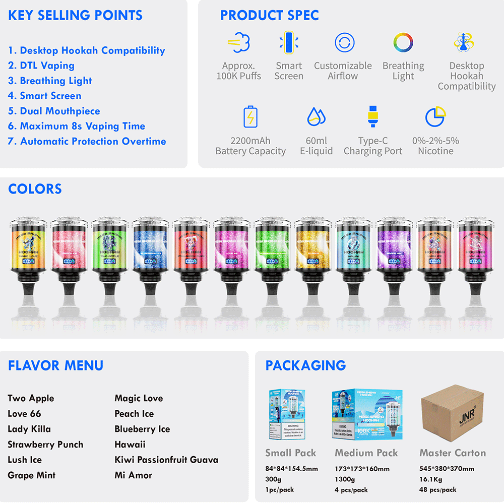 Redefine the vaping experience with the JNR Mega Shisha Hookah 100K Puffs Disposable Vape. Engineered for high-capacity performance and unparalleled convenience, this device brings together advanced features and luxurious design, perfect for solo sessions or sharing with friends.