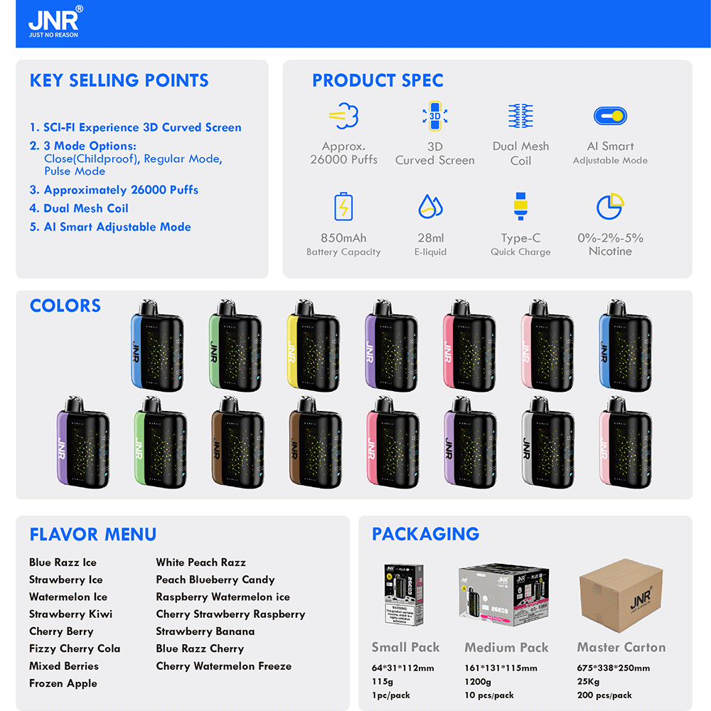 JNR Plus X 26000 Puffs Disposable Vape – the Newest Electronic Cigarette Pod that offers a stylish, intelligent vaping experience. Combining massive puff capacity with smart technology and a sleek design, this device caters to vapers who seek longevity, flavor, and the latest features.