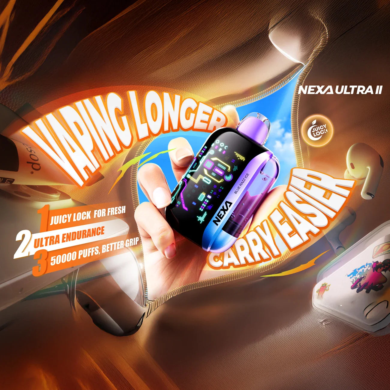 Because Nexa Ultra II isolates eliquid from the coil until activation, users enjoy fuller flavor, zero waste from stranded juice, and a consistently clean hit from first puff to last. The compact design supersedes bulkier high‑puff disposables without trading off power or battery life. Dual mesh coils ensure fast ramp and stable performance. And the Juicy Lock mechanism delivers peace of mind: no leaks, no stale flavor, and more effective use of every milliliter.