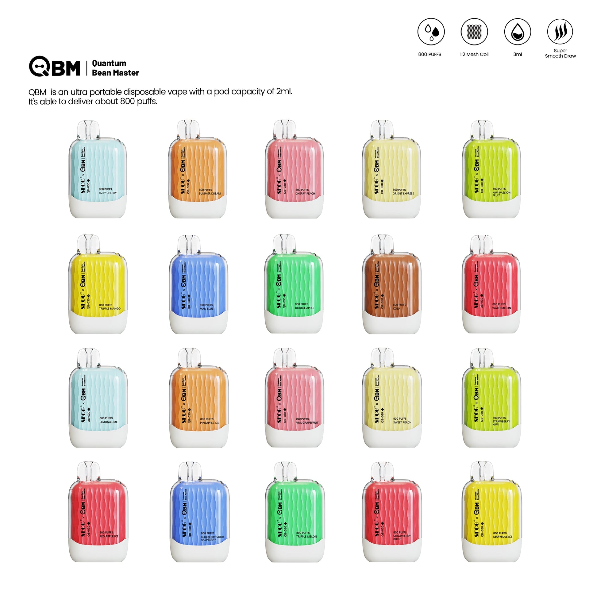 Revealing the SFOG QB030 Disposable Vape! With options for 600 or 800 puffs, this compact vape features a 400mAh battery and 2ml or 3ml e-liquid capacity. Enjoy smooth flavors from the upgraded mesh coil and choose from 20 delicious flavors. Plus, it’s easy to hang around your neck for on-the-go convenience!
