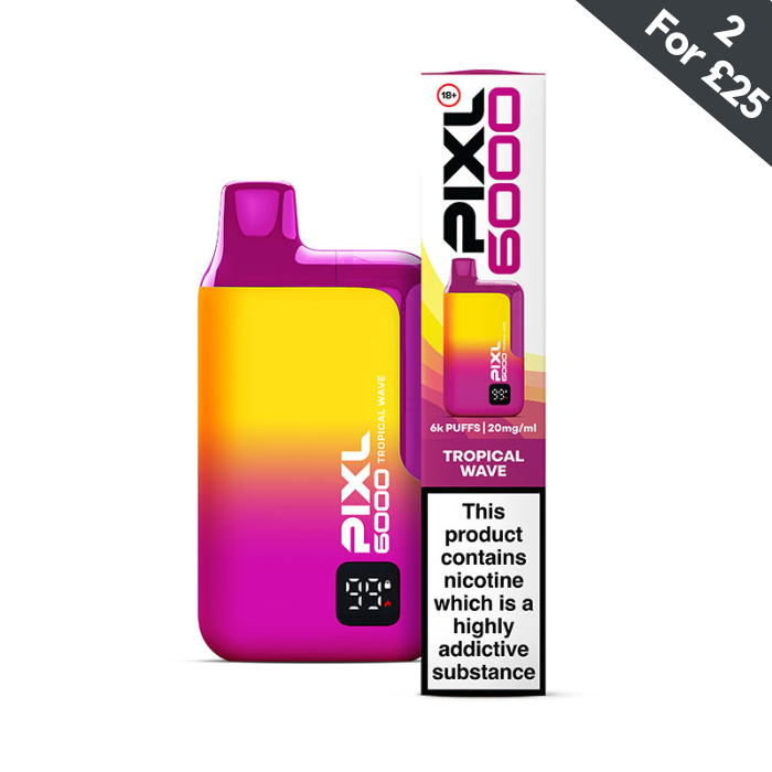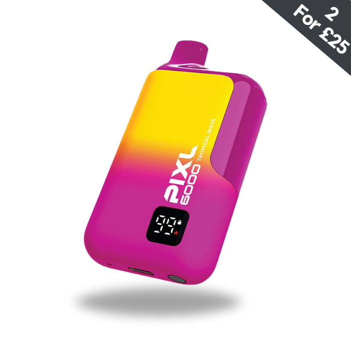 Experience a burst of tropical flavours with Tropical Wave By Pixl 6000. This disposable vape delivers a creamy coconut and tangy pineapple taste, complemented by zesty lime and juicy guava. With its compact design, it's perfect for on-the-go enjoyment. Vape with satisfaction, knowing you have the best flavours.