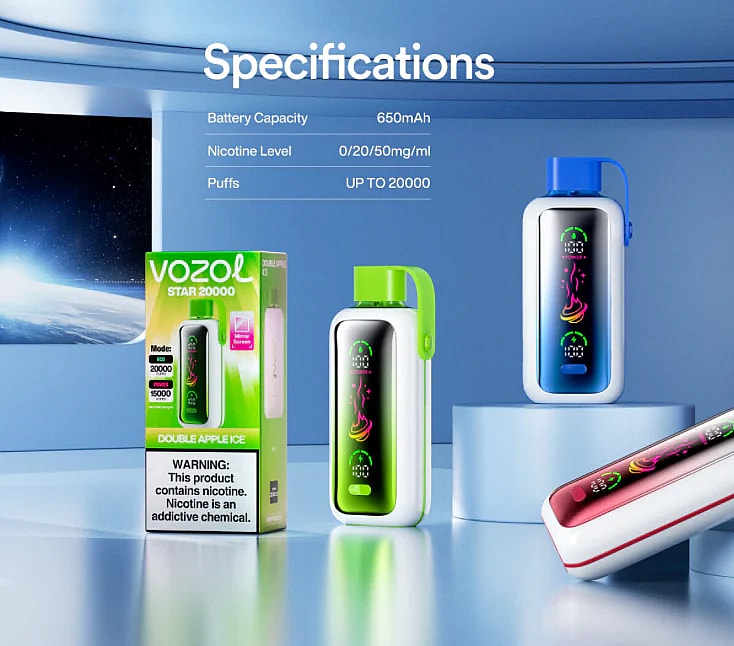 The Vozol Star 20K Puffs Disposable Vape features dual power modes, offering up to 20,000 puffs with a reliable 650mAh battery. Equipped with a 2.2″ HD mirror screen, it displays key information like battery level, puff count, and mode. With a generous 24mL capacity, 5% nicotine strength, and 21 different flavors, this device ensures an enjoyable, long-lasting experience. Its futuristic design combines style and performance, making it a perfect choice for vapers seeking both innovation and quality.