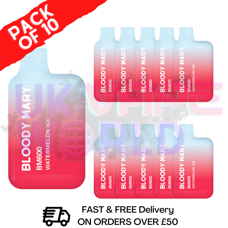 Watermelon ICE - Bloody Mary 600Puff Disposable Pack Of 10 smooth taste and gentle hit make it perfect for those looking for a flavorful yet mild vaping experience.