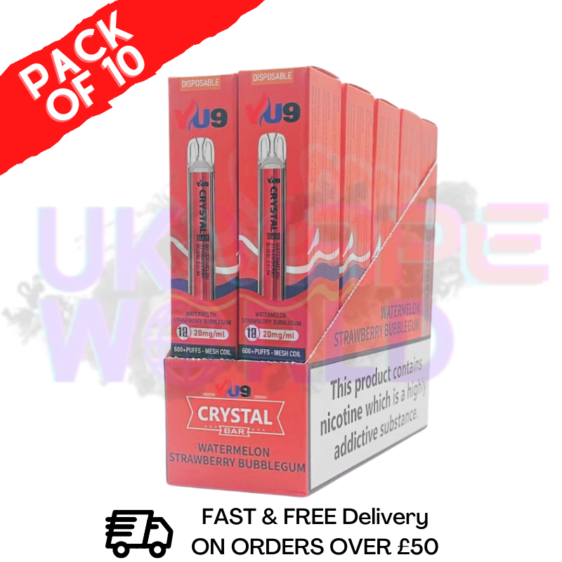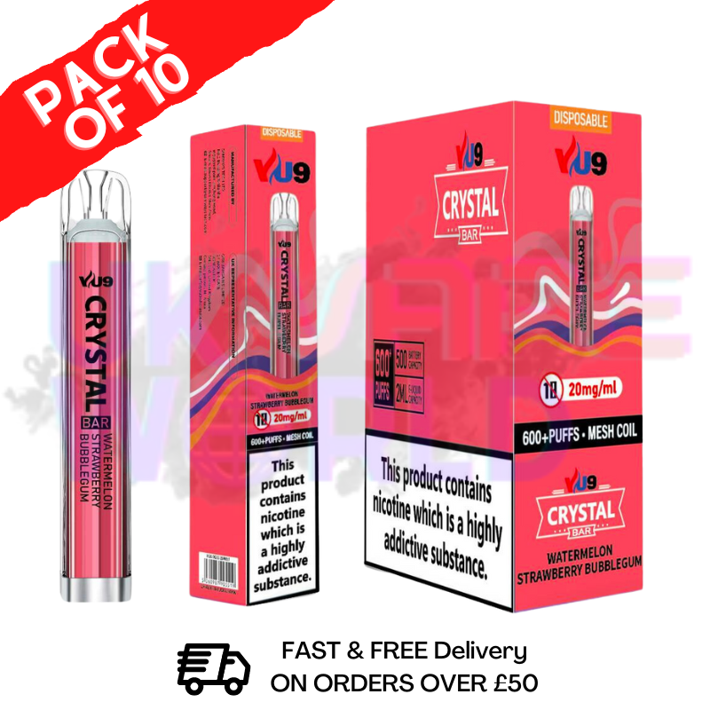 Watermelon Strawberry Bubblegum ICE Crystal VU9 Classic Pack Of 10 Cheap Disposable, the perfect combination of saccharine melons, sweet berries with a hint of blue-bubblegum for a unique flavor experience.