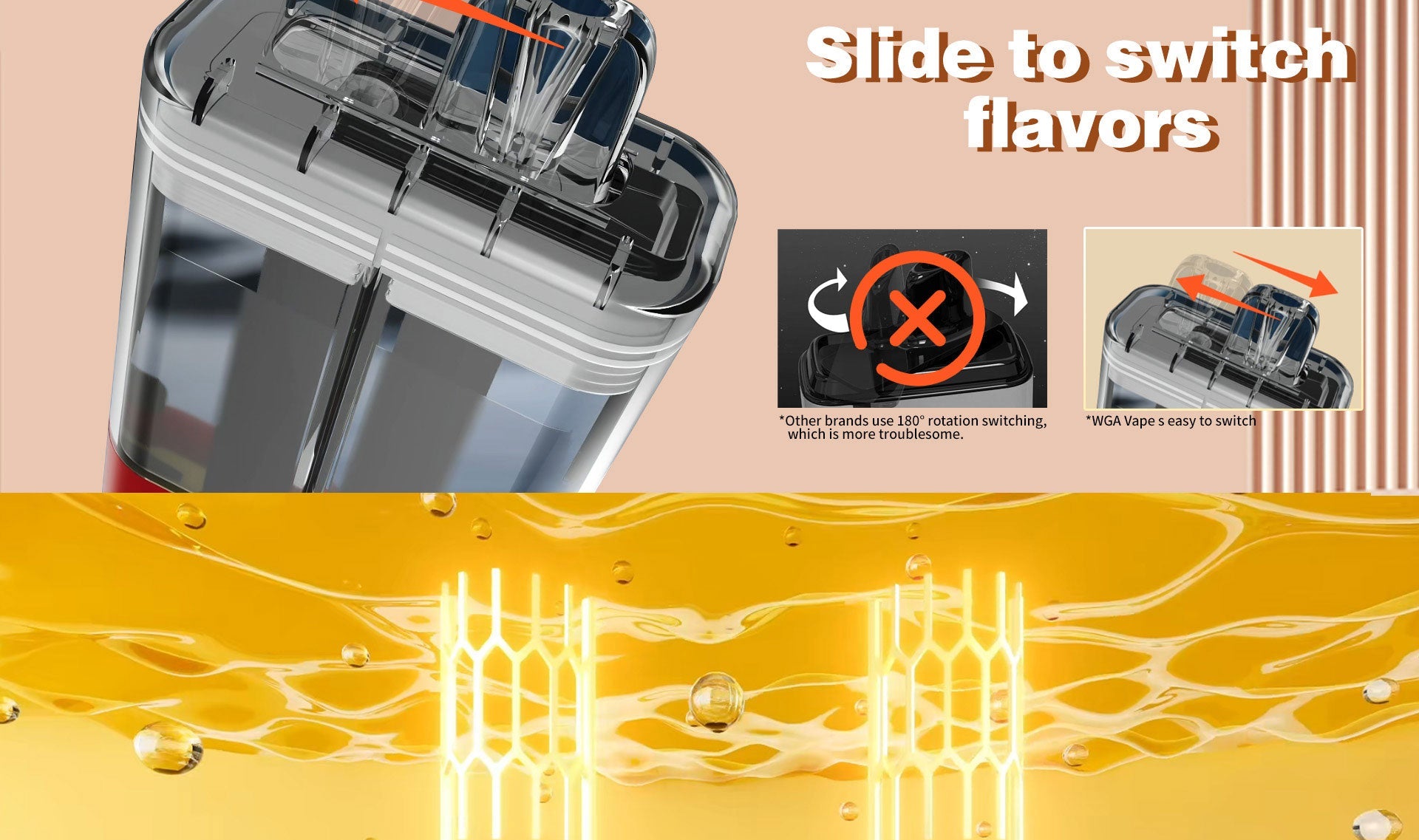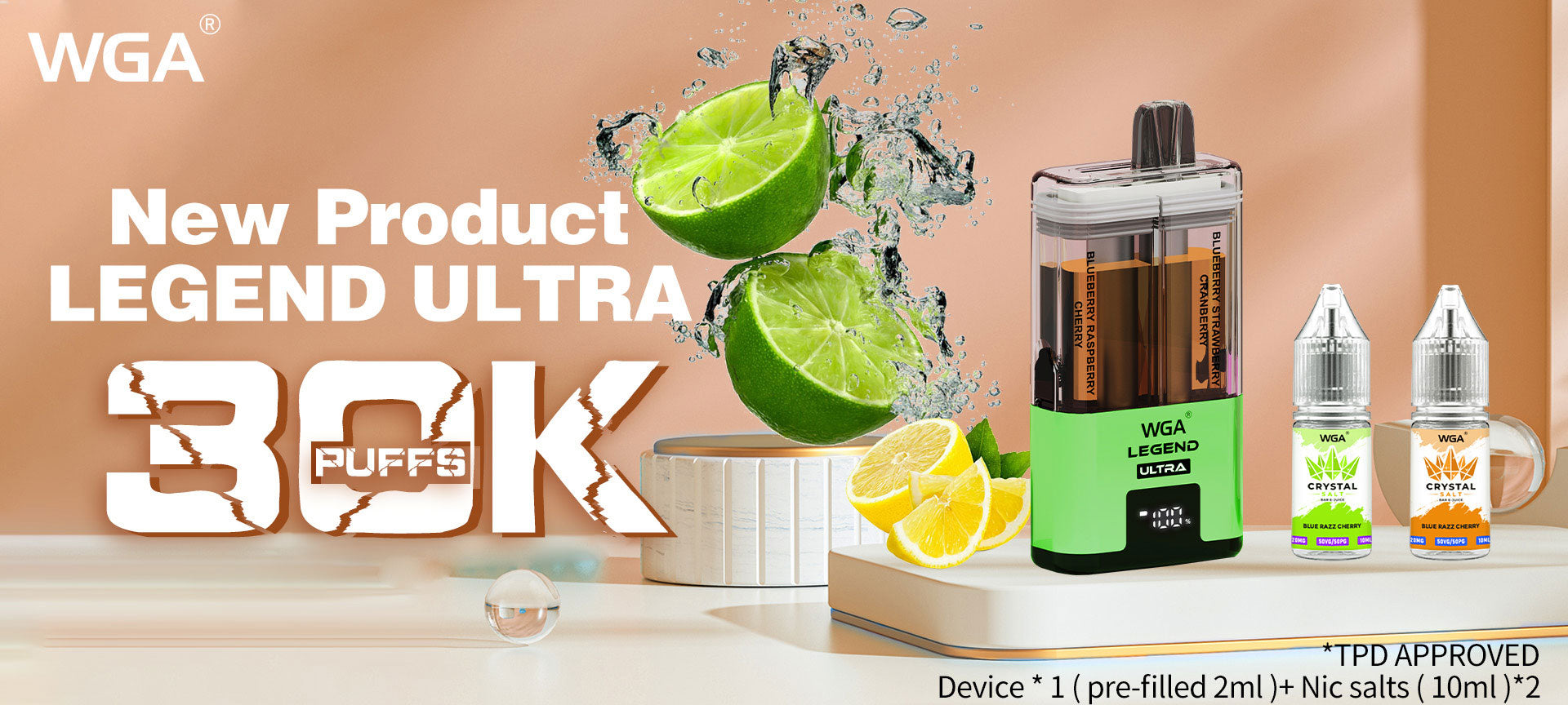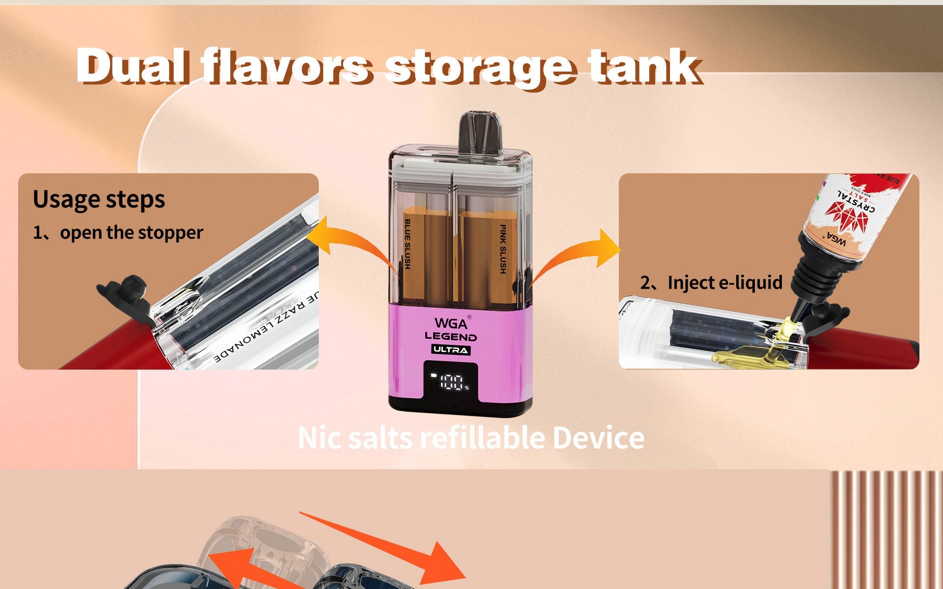 WGA 30000 puffs dual flavors disposable vape with40ml e-juice,nicotine strength of 2% and 5%,poweredby 650mAh battery, this disposable vape ensureslong-lasting usage, allowing you to enjoy up to 30000puffs without interruption. The included Type-Ccharging port provides quick and efficient charging.making it easy to keep your vape ready foraction.Each display box contains 10 pieces, with 15flavors to choose from, there's a perfect match forevery palate.Experience the ultimate in vapingconvenience and flavor with WGA 30000 puffsdisposable electronic cigarette!