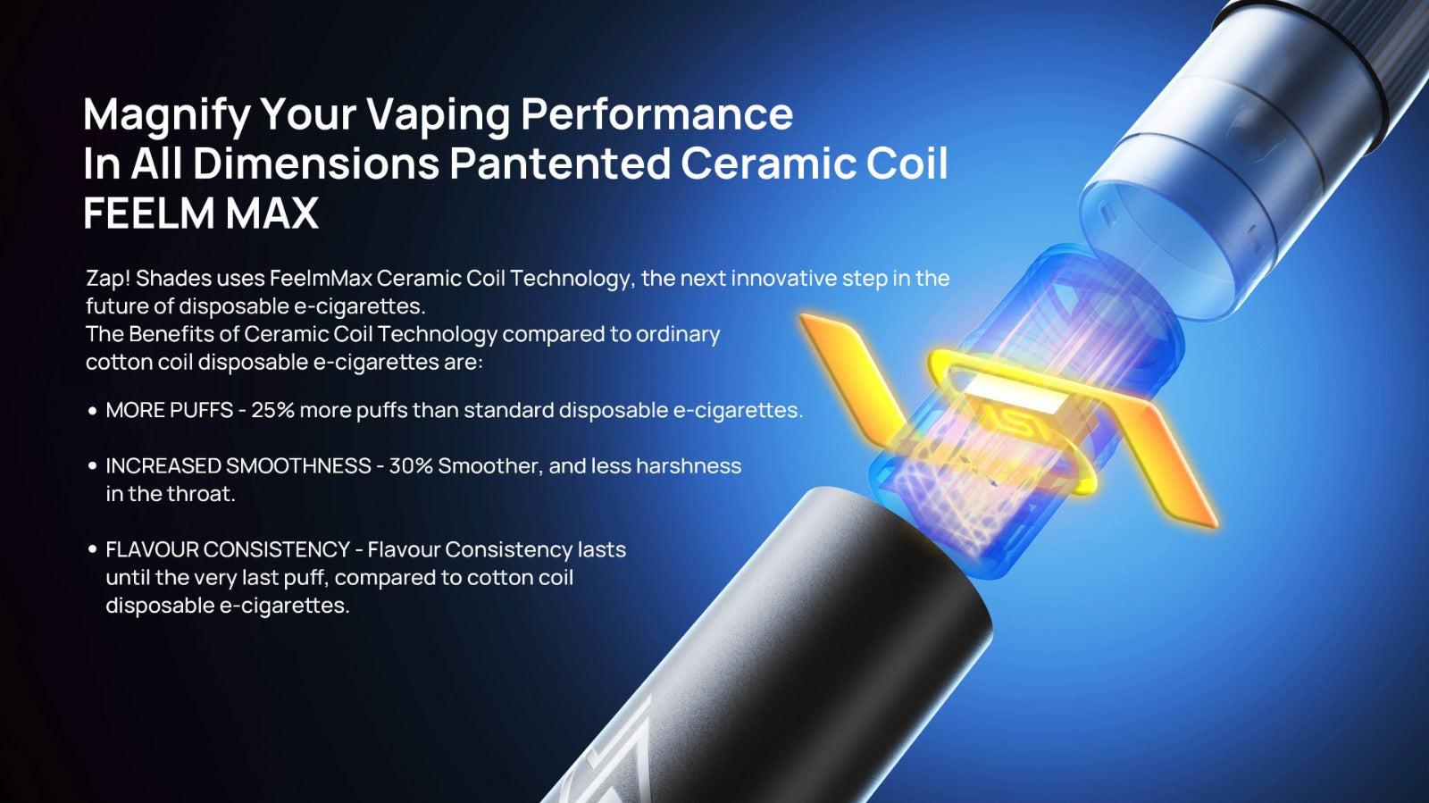 The Zap! Shades has a ceramic FEELM coil that uses less e-liquid, resulting in up to 25% more puffs, improved energy consumption efficiency, and a smoother taste and increased flavor.