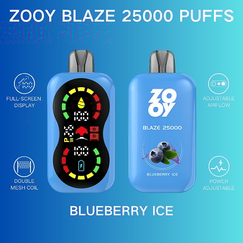Experience the ZOOY BLAZE 25000 Puffs Disposable Vape, designed for ultimate satisfaction. Enjoy up to 25,000 puffs with adjustable airflow and adjustable power for a customized vaping experience. Powered by a 650mAh rechargeable battery and equipped with double mesh coils, it delivers intense flavor and smooth vapor. The full screen display shows e-juice level, battery status, and power output. Fast Type-C charging ensures minimal downtime. Choose from 10 delicious flavors and three nicotine strengths: 2%, 3%, and 5% to match your preference.